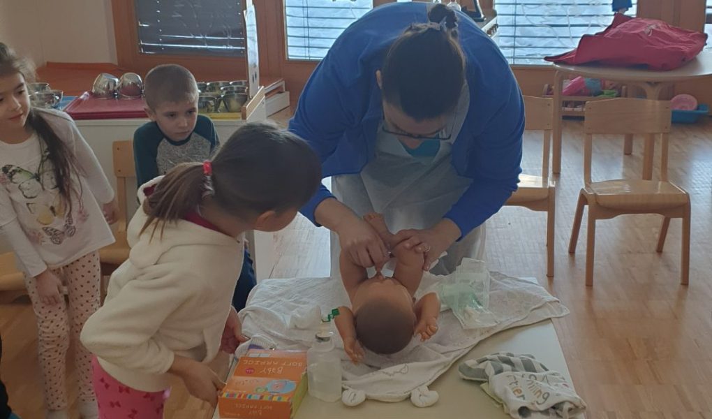 … je bila novica, ki nas je pri Lisičkah spodbudila k raziskovanju, kako otrok nastane in se razvija v maminem trebuščku, se rodi in kako raste. Na obisk smo povabili mamico Majo, ki nam je predstavila poklic babice in nas naučila, kako pravilno pestovati in negovati dojenčke.