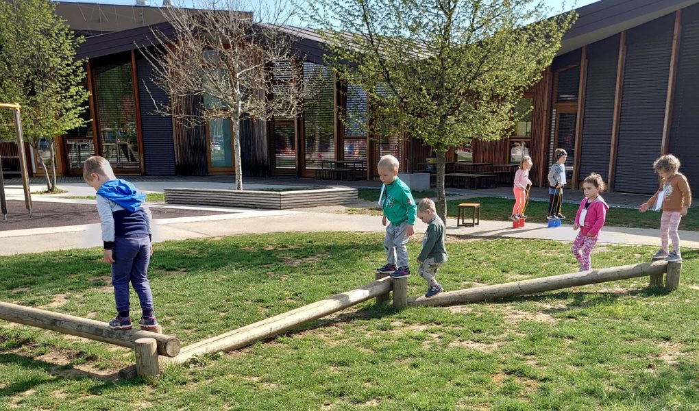 Skakanje v žakljih, vodenje žoge po poligonu, hoja s hoduljami, nošenje žogice na žlici in še in še…se je 5.maja dogajalo na vrtčevskem igrišču, ko so se otroci iz skupine Račk, Želvic, Žabic in Ribic s kartončki okrog vratu in v športnem duhu podali na poligon.