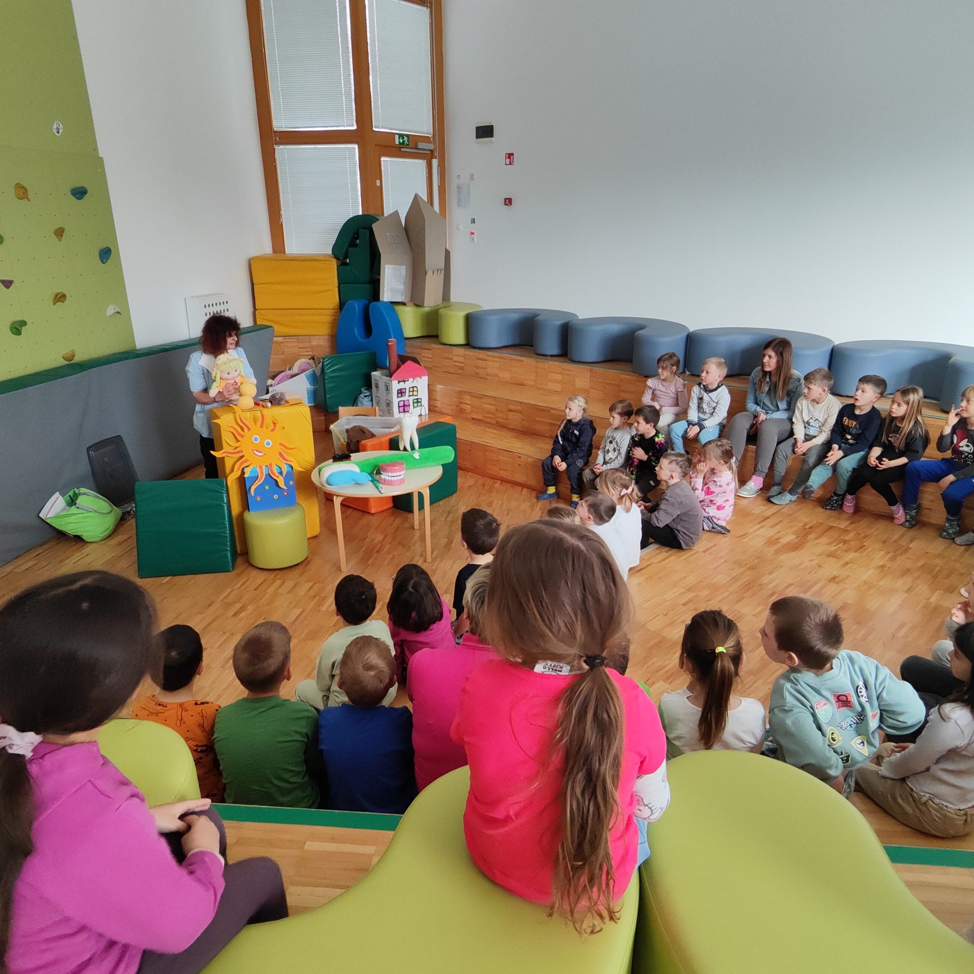 Skupini Medvedki in Srnice smo gostili medicinsko sestro Anko Debeljak, ki je otrokom na prijeten in igriv način približala pomen ustne higiene. S pomočjo zanimive lutkovne igrice o tem, kako si živali umivajo zobke, so tudi deklico Gajo spodbudile, da si je še ona z veseljem umila zobe.