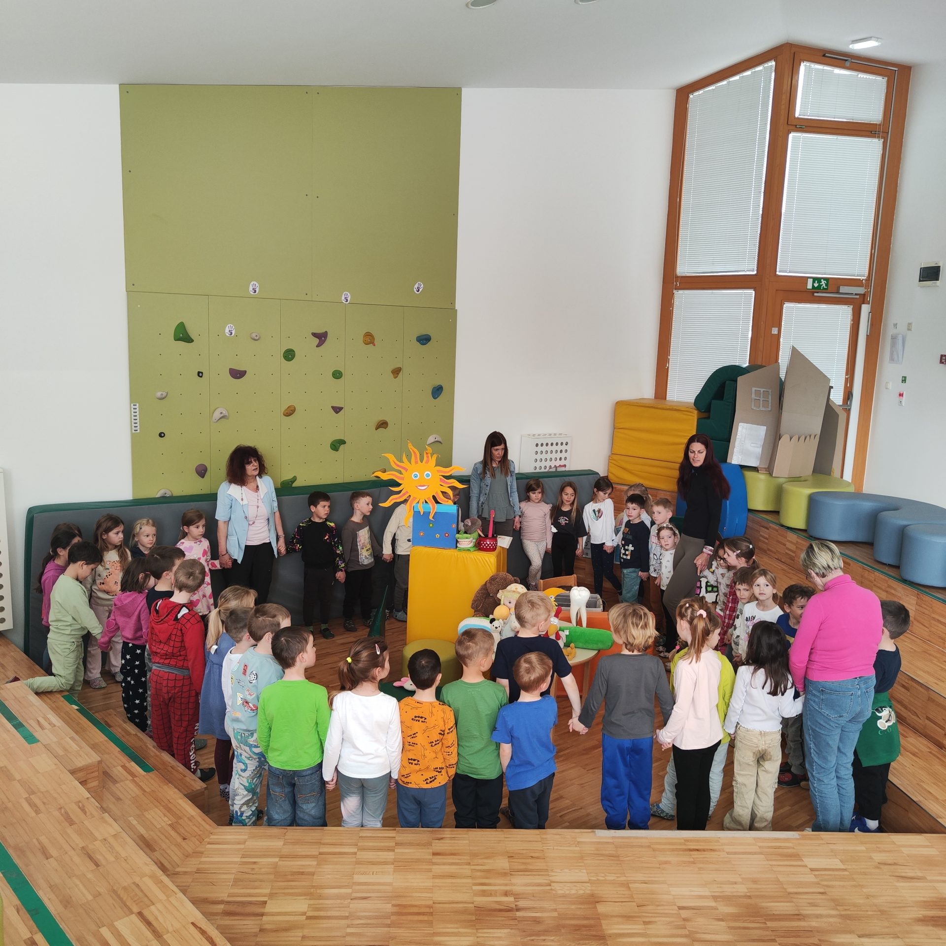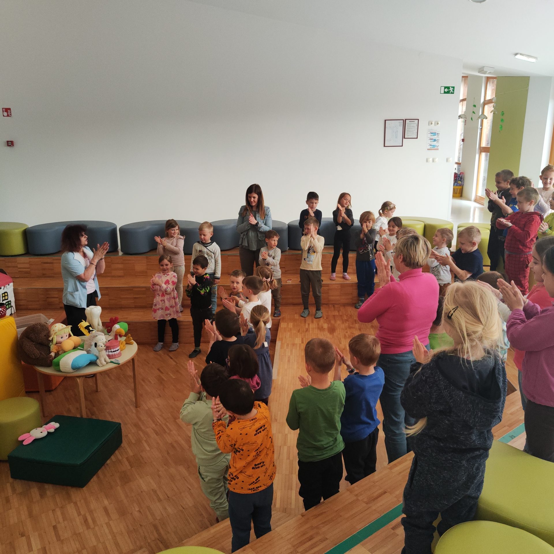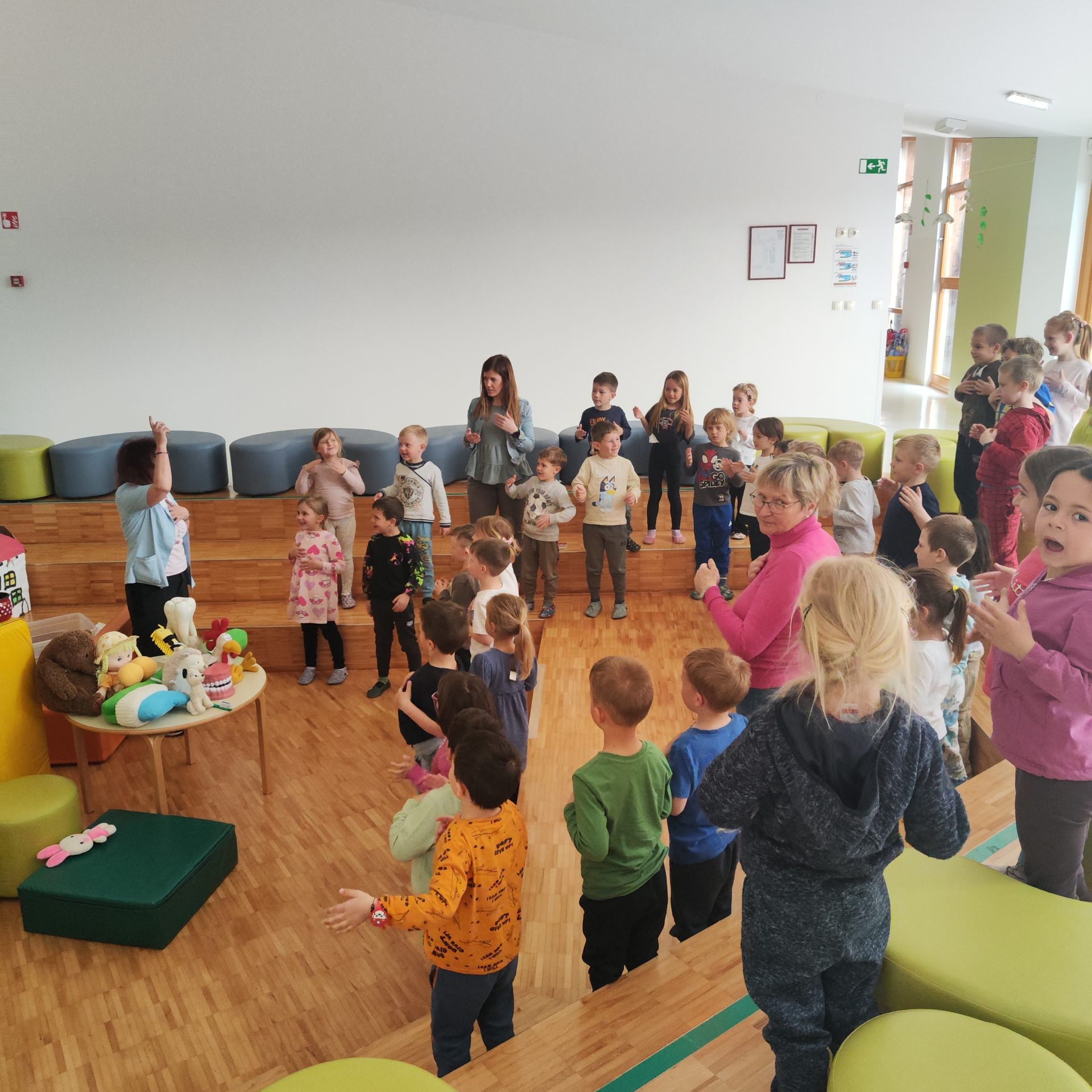 Medicinska sestra je otrokom nazorno prikazala pravilno umivanje zob s pomočjo modela krokodila, pri čemer so otroci aktivno sodelovali – šteli so gibe, jih ponazarjali z rokami ter pozorno spremljali prikaz. Skupaj smo se naučili tudi novo pesmico »Moji beli zobki«, ki smo jo ritmično spremljali s ploskanjem in topotanjem.