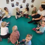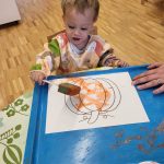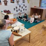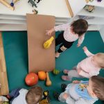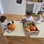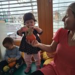 November je bil pri Kužkih v znamenju zgodbice Razbita buča. Začeli smo z igro z živalmi, ki nastopajo v zgodbici, kasneje pa smo dodali še buče, ki so nam jih prinesli otroci in starši. Živali smo uporabili tudi pri vsakodnevnem jutranjem pozdravu na blazini. Zgodbico sva otrokom pripovedovali ob ilustracijah in jim pripravili lutkovno predstavo, katero smo obogatili z zvočnimi efekti. Naučili pa smo se tudi novo pesmico Buča.
