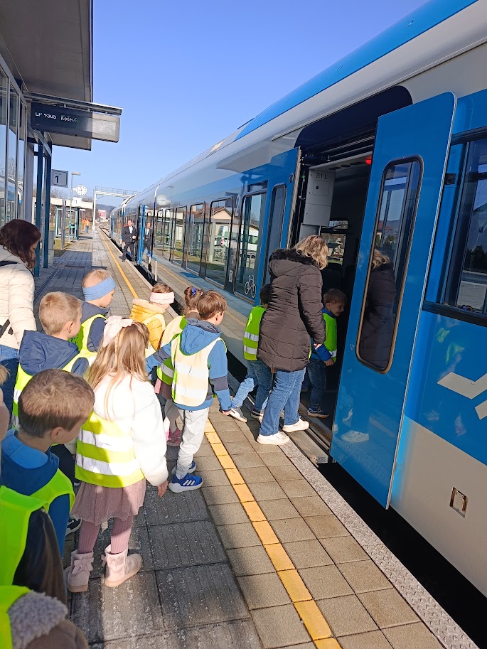 Otroci iz skupine Veveričke smo doživeli prav poseben dan. Podali smo se na nepozaben izlet z vlakom v sosednje Kočevje. Že sama vožnja po tirih je bila za male potnike prava pustolovščina; noski so bili pritisnjeni ob okna, pogledi so radovedno švigali po pokrajini, vagon pa je polnil naš veseli klepet.