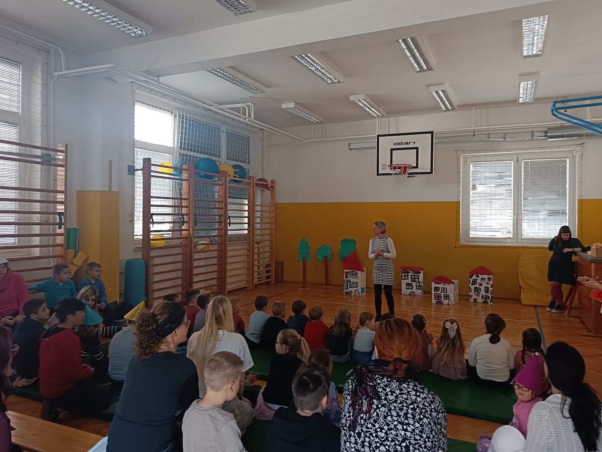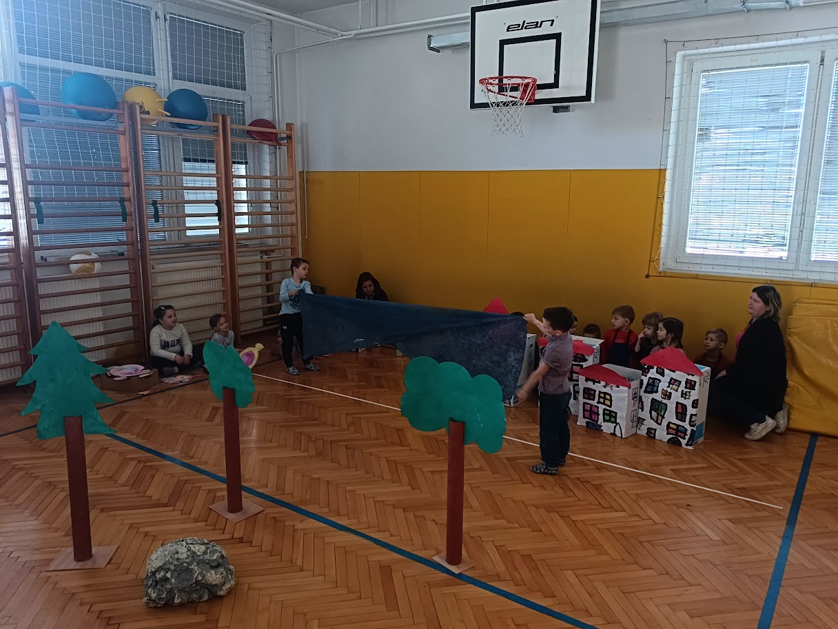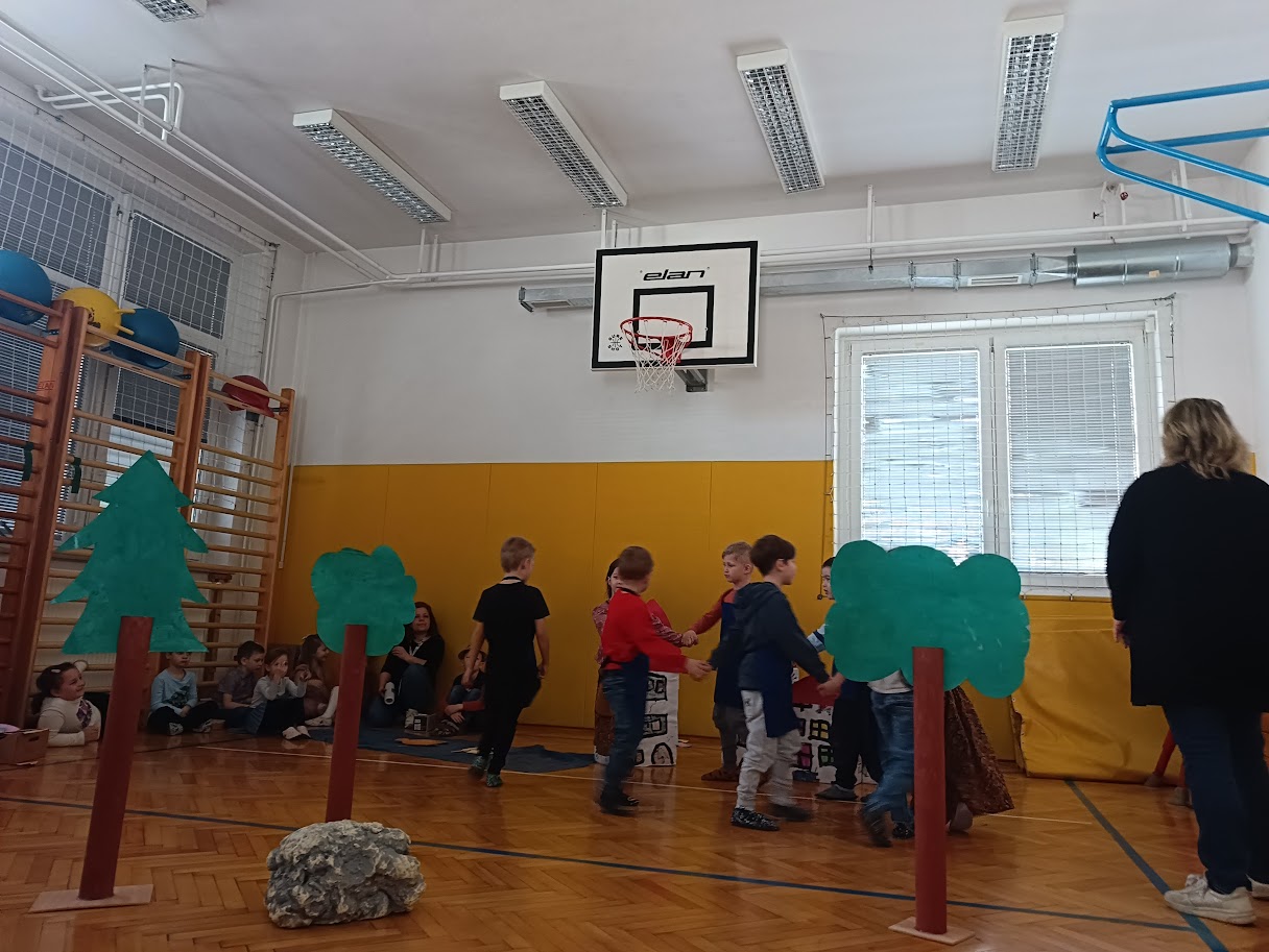 Seveda pa tudi mi nismo prišli praznih rok! Da bi nas novi prijatelji bolje spoznali, smo jim odigrali igro o velikanu in zlati ribici – pripovedko o nastanku Ribnice.