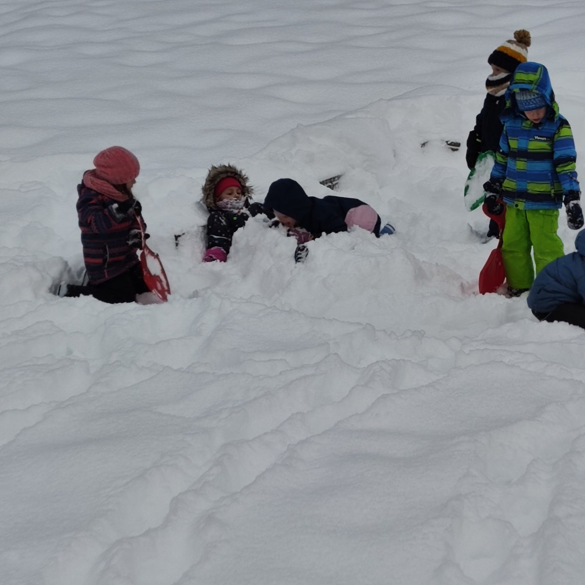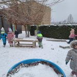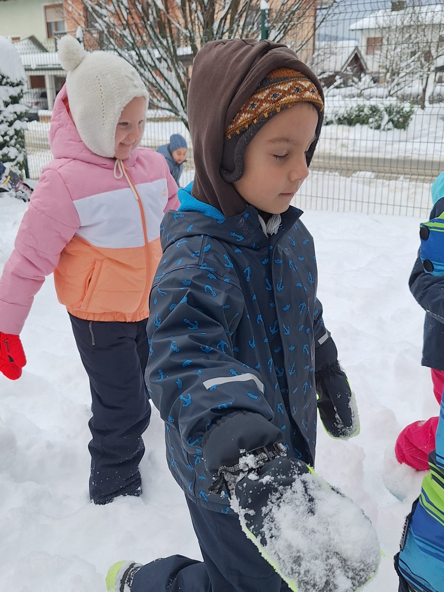 Zimski dnevi so nam letos podarili pravo snežno pravljico, ki smo jo z veseljem izkoristili za igro, raziskovanje in ustvarjanje. Otroci so se na snegu igrali, ga opazovali in doživljali z vsemi čuti.
