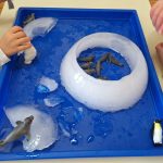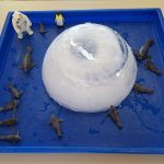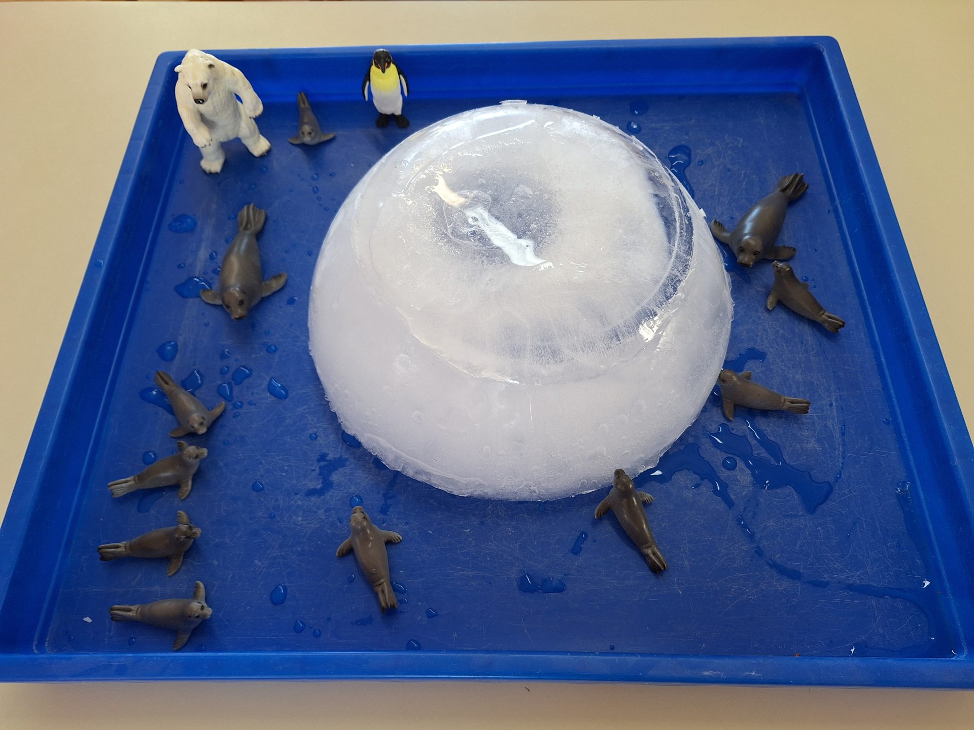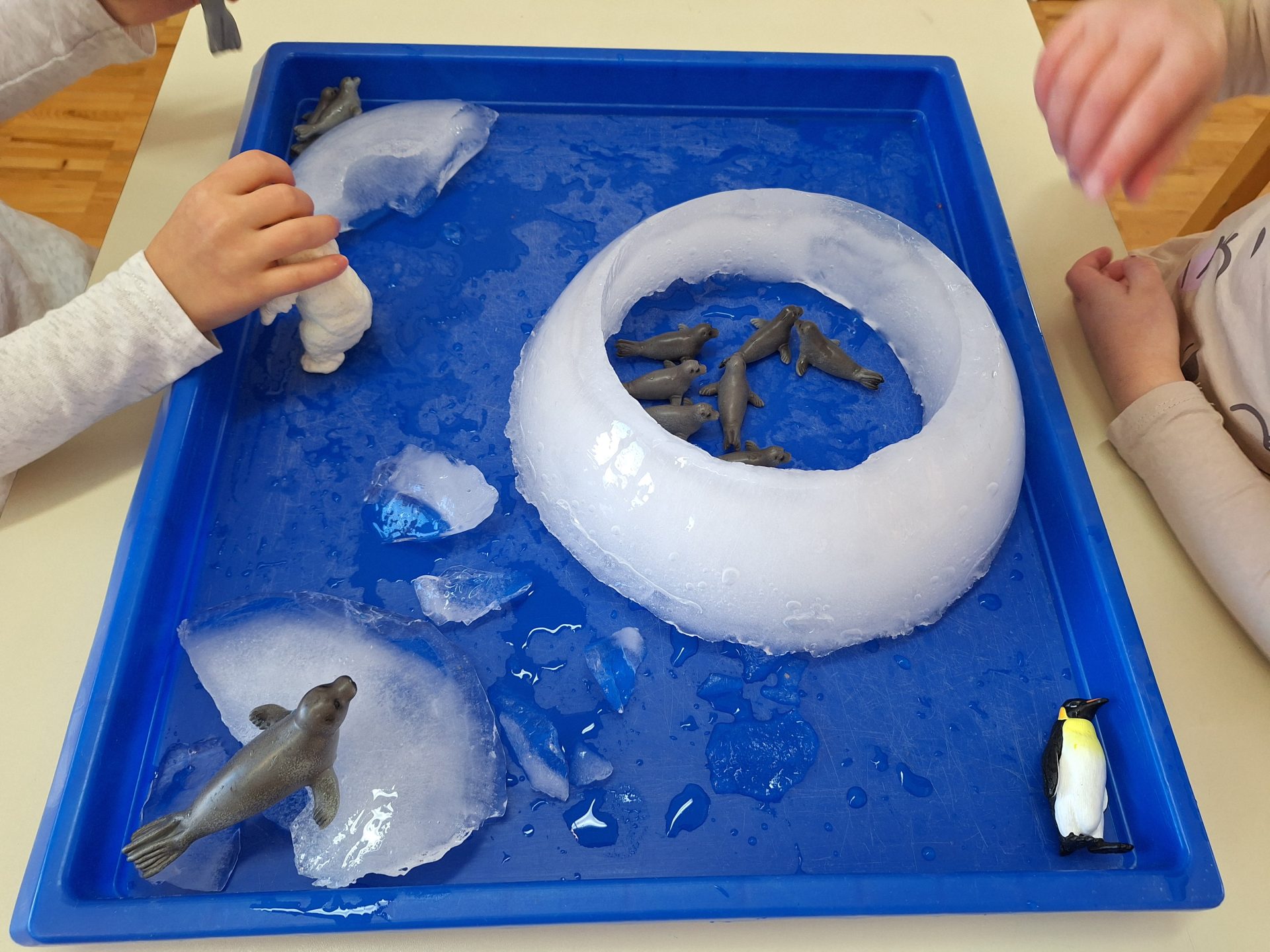 Posebno zanimanje je vzbudil iglu. Nizke temperature so nam omogočile eksperiment, da smo čez noč zunaj v posodi pustili vodo iz katere je nastal iglu. Otroci so ga z navdušenjem opazovali in se igrali z njim. Vanj so nameščali igrače živali ter si ob tem izmišljali raznolike zgodbe.